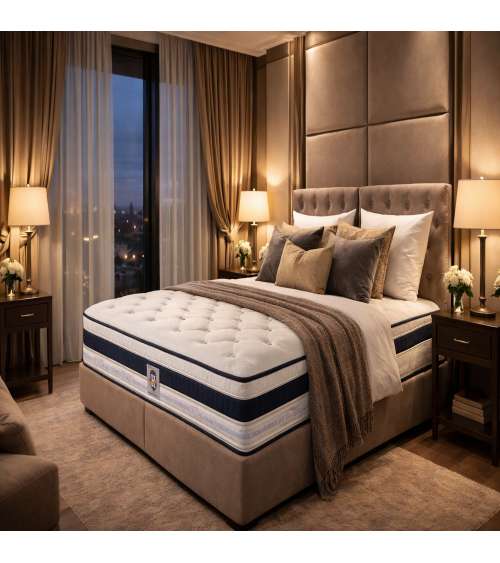 Matelas premium de 26 cm à ressorts ensachés et mémoire de forme issu de la gamme hôtelière à l’esthétique raffinée.