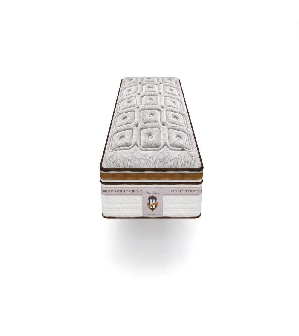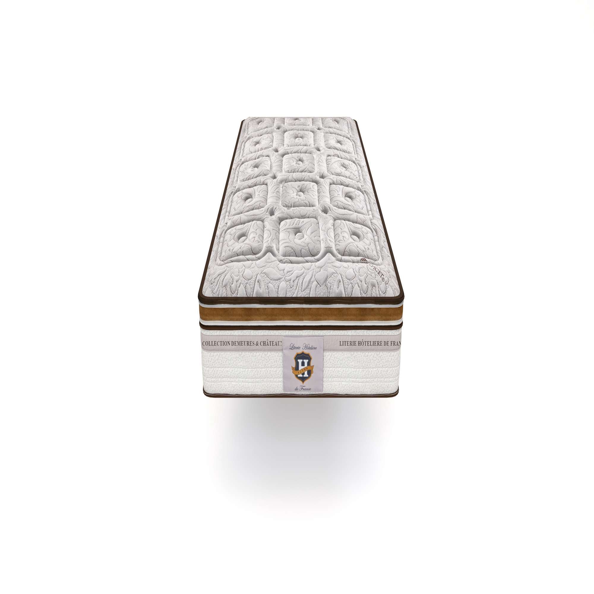 Matelas Renaissance – Confort hôtelier d’exception. Le matelas Renaissance de Literie Hôtelière de France associe un surmatelas intégré déhoussable et lavable à 30 °C à une suspension à ressorts ensachés multi-zones pour offrir un couchage haut de gamme alliant accueil enveloppant, soutien précis et hygiène irréprochable. Le surmatelas, composé d’un coutil stretch 280 g/m² 100 % polyester garni de ouate blanche 300 g/m², intègre 5 cm de mousse à mémoire de forme densité 60 kg/m³. La surface du matelas comprend un coutil supérieur en tissu 3D respirant avec ouate blanche 300 g/m² et fibres polyester 400 g/m². La structure de confort intègre 3 cm de mousse Soft T23SS et un feutre répartiteur de charge densité 1200 g/m². La suspension est composée de ressorts ensachés individuels avec 7 zones de fermeté différenciées. La structure est renforcée par un carénage périmétral de 10 cm en mousse haute résilience densité 30 kg/m³. Traitement anti-punaises de lit, Sanitized® et label Oeko-Tex®. Épaisseur 30 cm. Fermeté 4/5. 1 face de couchage non réversible. 4 poignées horizontales. Garantie 5 ans. Fabriqué en Italie. Nombre de ressorts : 80x190 (760), 80x200 (800), 90x190 (855), 90x200 (900), 140x190 (1330), 140x200 (1400), 160x200 (1600), 180x200 (1800), 200x200 (2000).