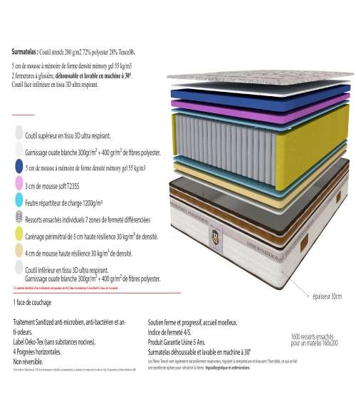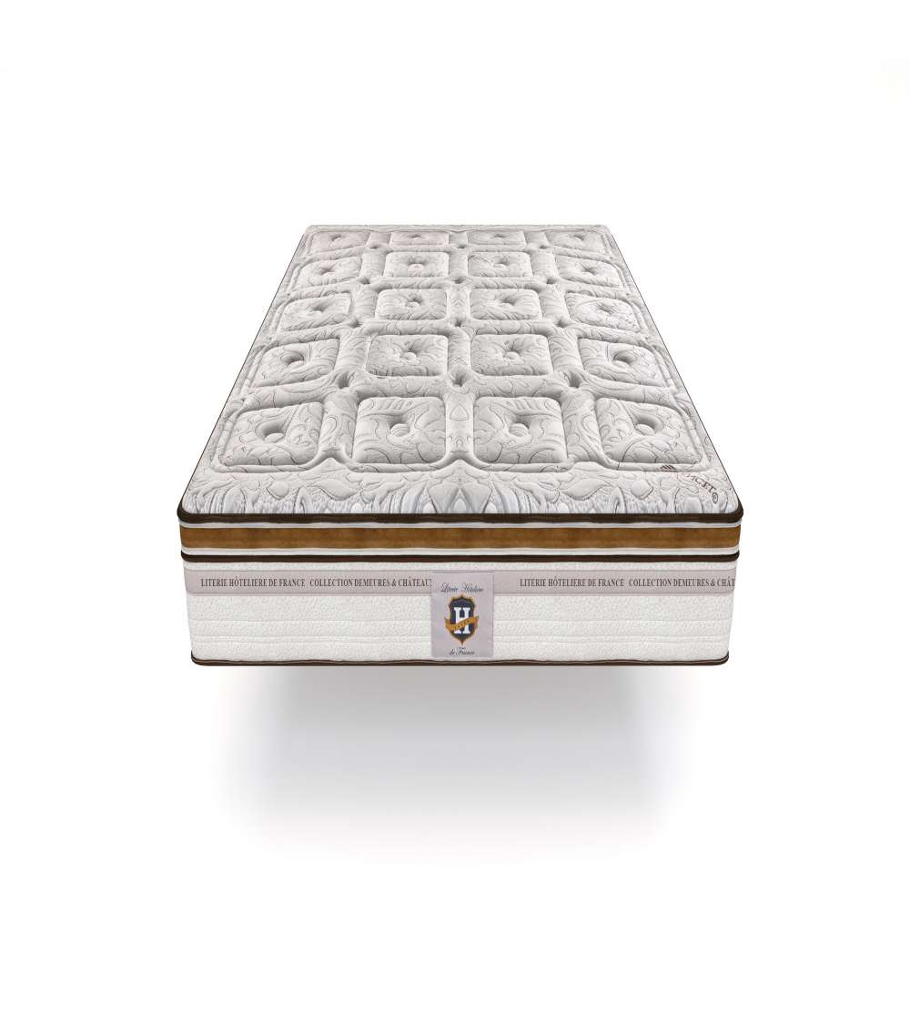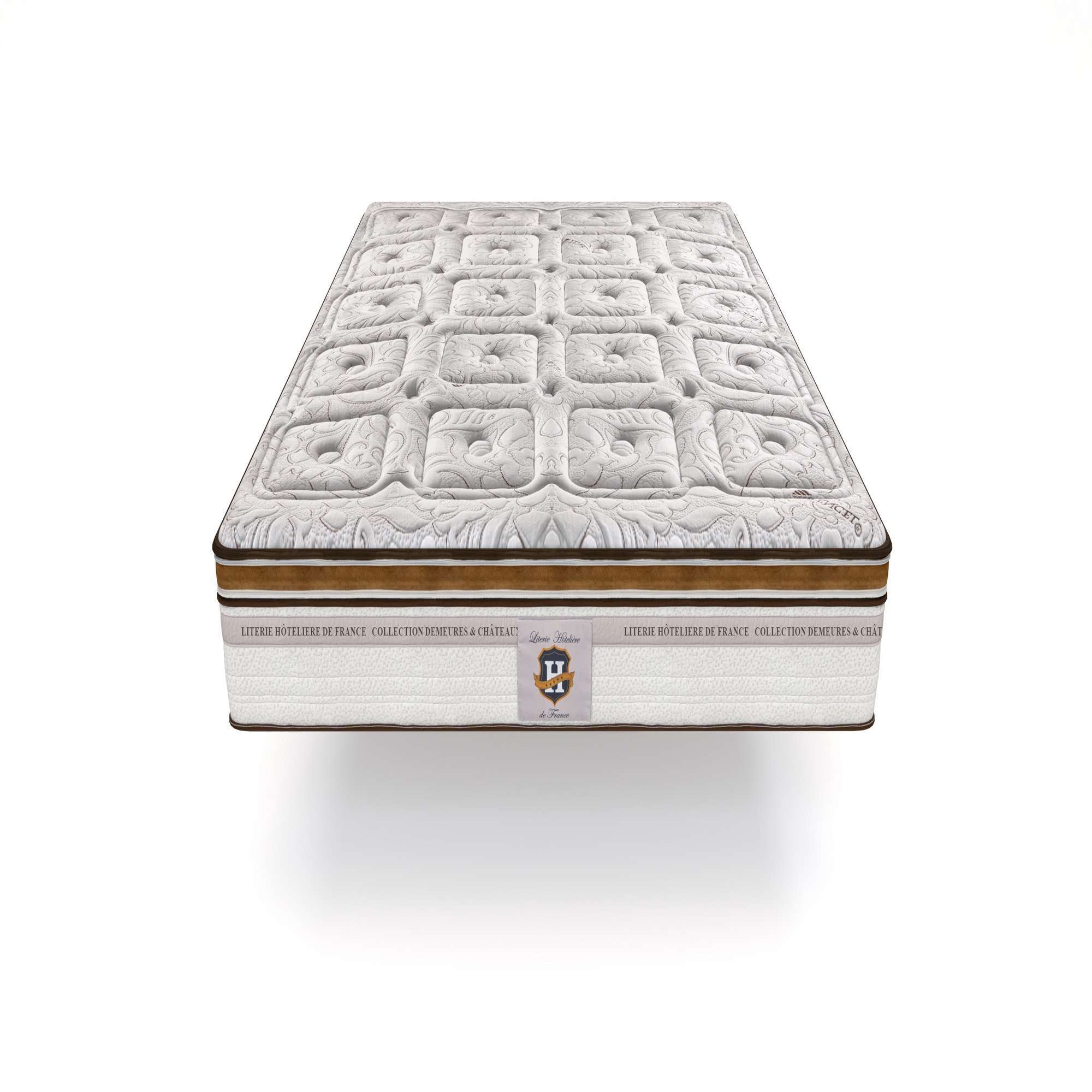 surmatelas intégré déhoussable et une suspension ressorts ensachés multi-zones.Matelas Renaissance – Confort hôtelier d’exception. Le matelas Renaissance de Literie Hôtelière de France associe un surmatelas intégré déhoussable et lavable à 30 °C à une suspension à ressorts ensachés multi-zones pour offrir un couchage haut de gamme alliant accueil enveloppant, soutien précis et hygiène irréprochable. Le surmatelas, composé d’un coutil stretch 280 g/m² 100 % polyester garni de ouate blanche 300 g/m², intègre 5 cm de mousse à mémoire de forme densité 60 kg/m³. La surface du matelas comprend un coutil supérieur en tissu 3D respirant avec ouate blanche 300 g/m² et fibres polyester 400 g/m². La structure de confort intègre 3 cm de mousse Soft T23SS et un feutre répartiteur de charge densité 1200 g/m². La suspension est composée de ressorts ensachés individuels avec 7 zones de fermeté différenciées. La structure est renforcée par un carénage périmétral de 10 cm en mousse haute résilience densité 30 kg/m³. Traitement anti-punaises de lit, Sanitized® et label Oeko-Tex®. Épaisseur 30 cm. Fermeté 4/5. 1 face de couchage non réversible. 4 poignées horizontales. Garantie 5 ans. Fabriqué en Italie. Nombre de ressorts : 80x190 (760), 80x200 (800), 90x190 (855), 90x200 (900), 140x190 (1330), 140x200 (1400), 160x200 (1600), 180x200 (1800), 200x200 (2000).