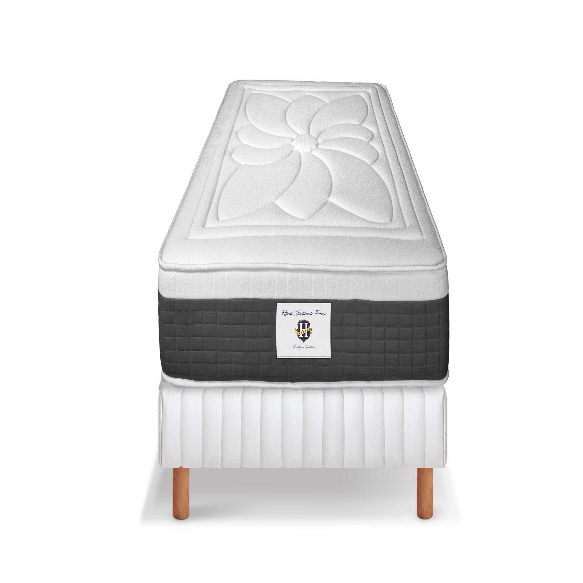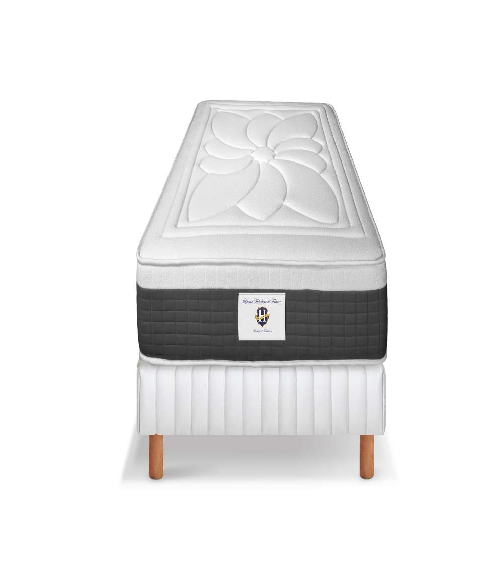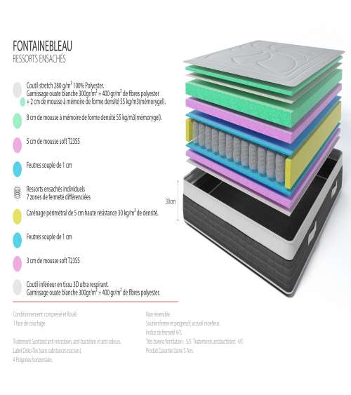 Ensemble Fontainebleau – L'expérience du sommeil grand hôtel. Le matelas Fontainebleau offre un confort hôtelier haut de gamme grâce à ses 30 cm d'épaisseur, ses 7 cm de mémoire de forme Memory Gel et sa suspension à ressorts ensachés 7 zones. Il épouse les courbes du corps, soulage les points de pression et procure un accueil équilibré et individualisé. Sa plate-bande Trip'Air 3D respirante favorise la ventilation pour un couchage plus frais et sain. Sa structure comprend un coutil stretch 280 g/m², ouate 300 g/m², fibres 400 g/m², 7 cm mémoire gel densité 55 kg/m3, 5 cm mousse Soft T23SS, feutre 1 cm, ressorts ensachés 14,5 cm avec 7 zones, carénage mousse densité 30 kg/m3 et face inférieure tissu 3D respirant. Traitements Sanitized et Oeko-Tex. Épaisseur 30 cm. Fermeté 4/5. Maintien précis et excellente indépendance de couchage. Nombre de ressorts : 80x190 (358), 80x200 (378), 90x190 (403), 90x200 (425), 140x190 (628), 140x200 (661), 160x200 (757), 180x200 (850), 200x200 (945). Sommier tapissier à lattes recouvertes. Structure en sapin blanc du Nord, 12 lattes en bois massif, ou 13 en longueur 200 cm, avec renforts longitudinaux adaptés. En 160x200, traverse pour 5e pied central. Angles renforcés en hêtre. Revêtement tissu stretch 100 % polyester 185 g/m², avec toile anti-poussière. Livré monté avec 4 pieds en hêtre vernis de 15 cm. Hauteur sommier 15 cm, hauteur totale 30 cm, garantie 5 ans, fabrication française.
