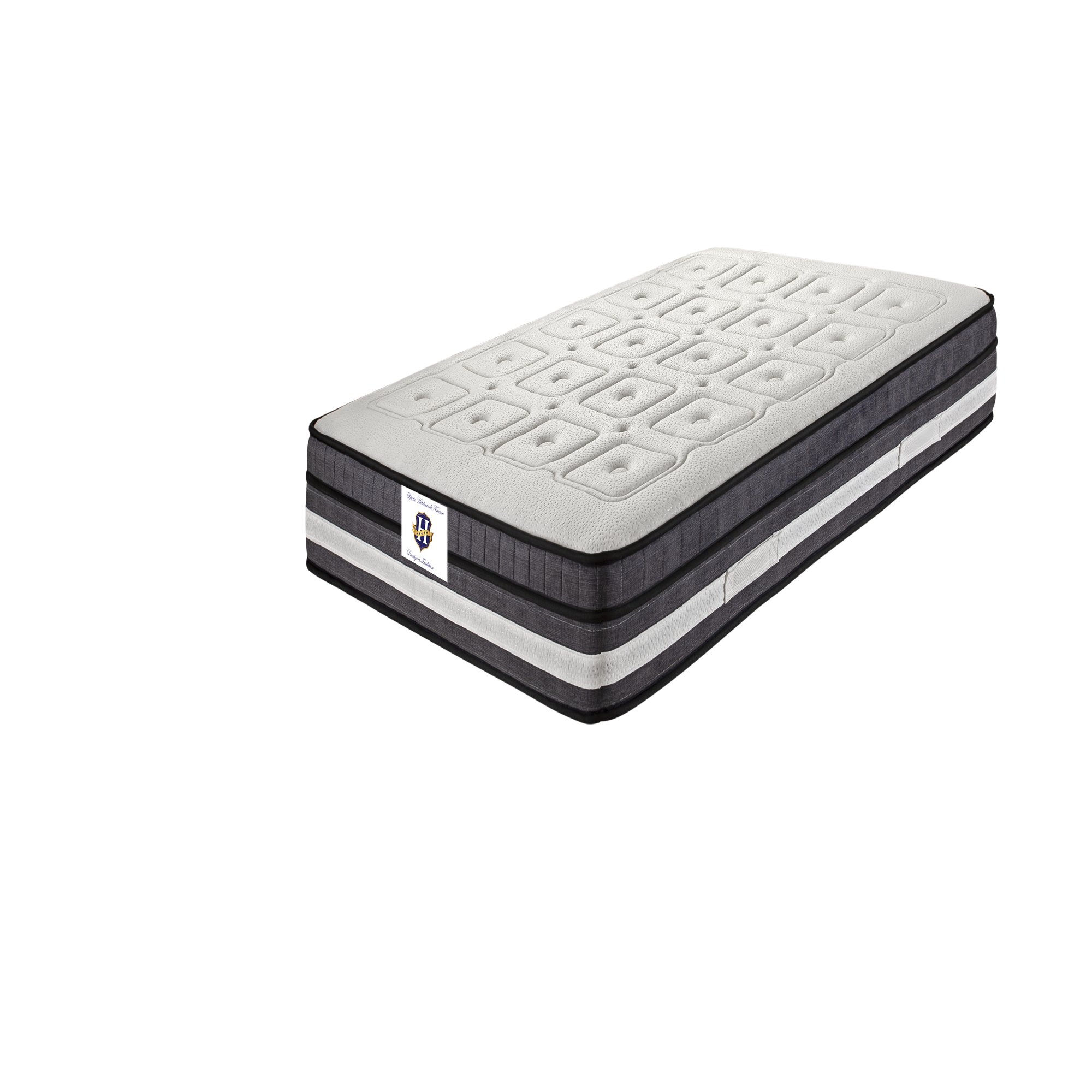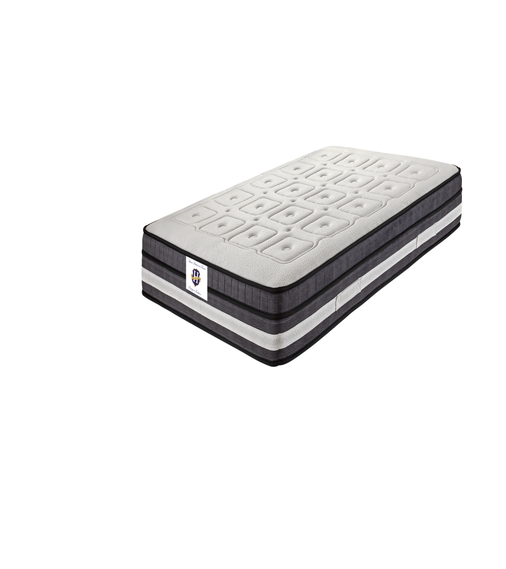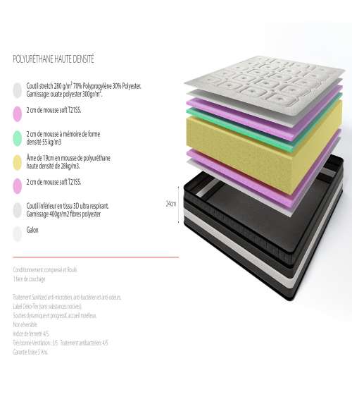 Matelas Âme de 19cm en mousse de polyuréthane haute densité de 28kg/m3, sur-matelas cousu, avec 2 cm de mousse soft T21SS + 2 cm de mousse à...